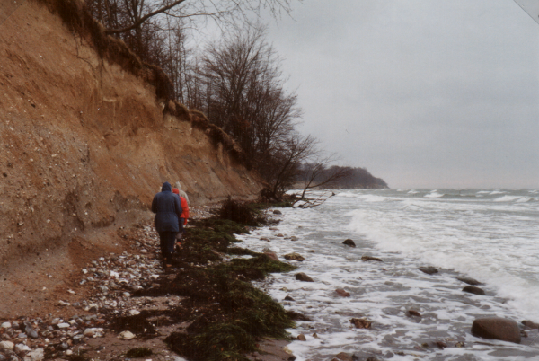 Lørdag den 20. november 1993. Allerede klokken 10 er vi klar til at starte. Vi er ikke meget for at komme ud af bilerne. Det stormer og er koldt og gråt. Stedet er Gjorslev Havn, hvor vi sluttede efter den lange og seje tur Stevns rundt. Det er somom vi ikke har gjort os nogle forhåbninger om den nye tur. Vi har imidlertid ikke gået ret langt før vi bliver glædelig overrasket. Havet er grå-grønt med store bølger, der uafbrudt ruller skummende hvide ind mod stranden. En bræmme af nyopskyllet søgræs ligger lige i vandkanten og af og til hører man gennem stormens og havets brølen rullestenenes raslen mod hinanden. Vi er heldige at have side-rygvind, og vi får hurtigt varmen ved at gå. - Allerførst forbi Traktørstedet "Bøgeskoven" med røde træhuse og et stakkels lille forblæst Dannebrogs flag. Så går vi under høje lerskrænter på en noget stenet strand med stenhøfter ud i det oprørte hav, det er vanskeligt at forestille sig, at man en varm sommerdag sikkert kan finde gode bademugligheder her, men det ser faktisk ud somom der mellem høfterne er fin sandbund. Det er fantastisk med de brølende bølger. Og nu er der også små snefnug i luften ! Store væltede træer ligger på den smalle strandbred. Bølgerne er lige ved at løbe os op om fødderne. Det er et flot skue det hele.
